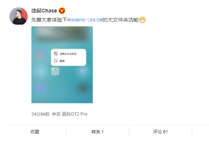 今日,真我realme副总裁、全球营销总裁、中国区总裁徐起曝光了realmeUI4.0的大文件夹功能。从图片中可以看出,realmeUI4.0支持将手机上的传统文件夹切换为大文件夹,或者直接解散文件夹。对此,有网友表示该功能“有点眼熟”。