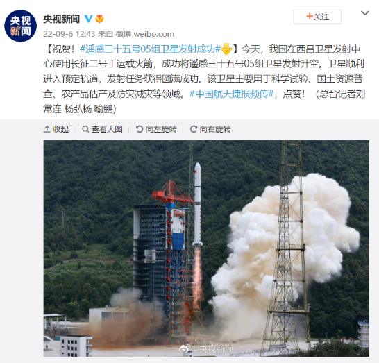9月6日,据央视新闻报道,中国今天在西昌卫星发射中心使用了长征2号丁运载火箭,成功发射了遥感35号05组卫星。卫星成功进入预定轨道,发射任务成功。