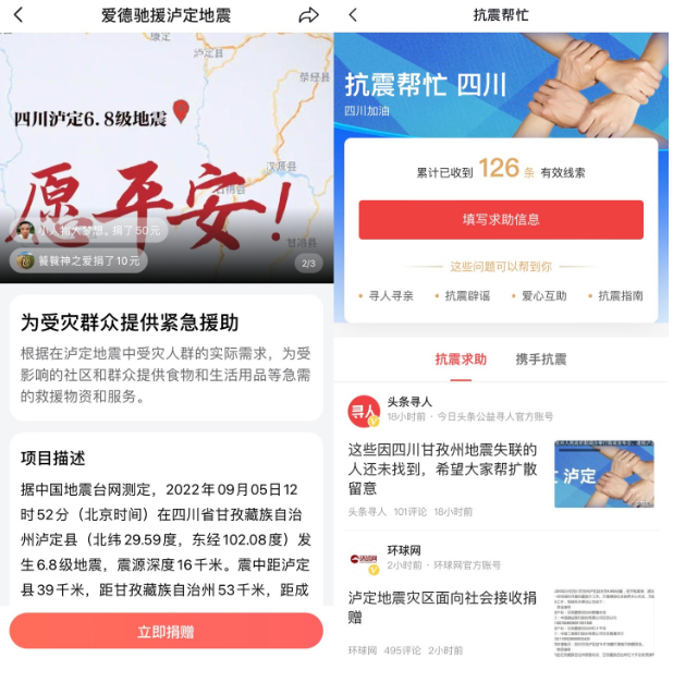 目前,字节跳动公益平台已推出多项支持泸定的公益活动,与爱德基金会、中国社会福利基金会、重庆慈善总会合作,为地震灾区筹集资金。此外,字节跳动的产品抖音,今日头条已经推出“抗震帮助通道”,为地震灾区提供紧急寻人服务,收到数百条有效线索。