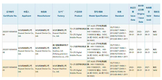 今日新闻,华为Mate50E(型号为CET-AL60)得到3C认证,其充电器型号为HW-110600C01,与Mate50Pro同样,均支持66W有线闪充。