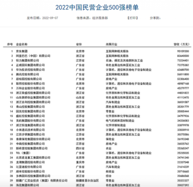 9月7日,全国工商联公布了2022年中国民营企业500强,京东、阿里巴巴位居前两位。