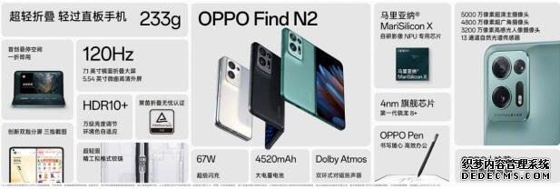 其它方面,OPPO Find N2配备内外双E6材质120Hz高刷屏幕,均支持环境色自适应,内置高通骁龙8+处理器,辅以LPDDR5内存和UFS 3.1闪存,性能强劲。4520mAh电池和67W超级闪充,可以带来强劲的续航能力和快充体验。此外OPPO Find N2支持自研的OPPO Pen手写笔,该笔采用1.4mm超纤细笔尖设计,支持4096级压感检测,进一步强化日常交互体验。