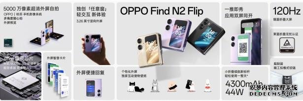 硬件配置上,OPPO Find N2 Flip内屏采用6.8英寸E6材质120Hz高刷屏,最高亮度可达1600nit。同样采用新一代超轻固精工拟椎式铰链,整机重量仅为191克,内置天玑9000+处理器,拥有4300mAh大电池,同时还配备了44W超级闪充,充电更加快速。