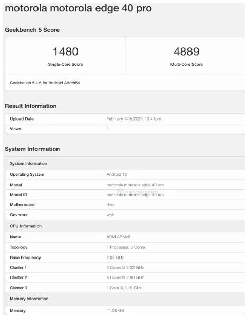 根据基准数据库,Moto Edge 40 Pro配备了ARMv8处理器,包括三核2.02GHz、四核2.80GHz和一核3.19GHz。它对应于骁龙8 Gen 2 SoC。清单上提到了12GB内存,但我们可以期待在发布时有更多的选择。这款智能手机将开箱运行Android 13操作系统。在Geekbench的单核和多核测试中,Moto Edge 40 Pro分别获得了1480分和4889分。