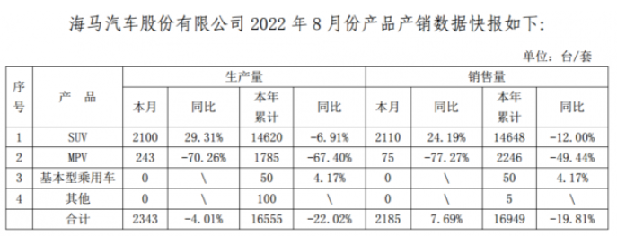 9月6日晚,海马发布8月份商品产销数据快报,称8月份汽车销量2185辆,同比增长7.69%;1-8月销量16949辆,同比下降19.81%。