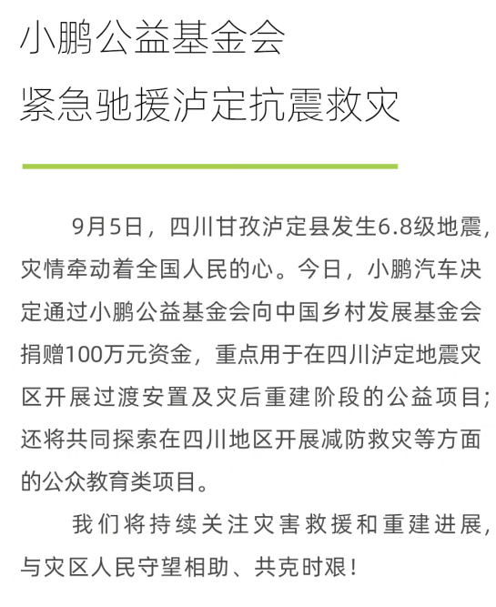 9月5日,四川省甘孜州泸定县发生6.8级地震。地震发生后,包括中国一汽、比亚迪、宁德时代等企业在内的多家汽车相关企业纷纷捐款物资帮助灾区。9月8日,另一支新的汽车制造力量小鹏汽车加入了四川的救援队伍。小鹏汽车官网表示,将向四川泸定捐赠100万元用于灾害救援和灾后重建。